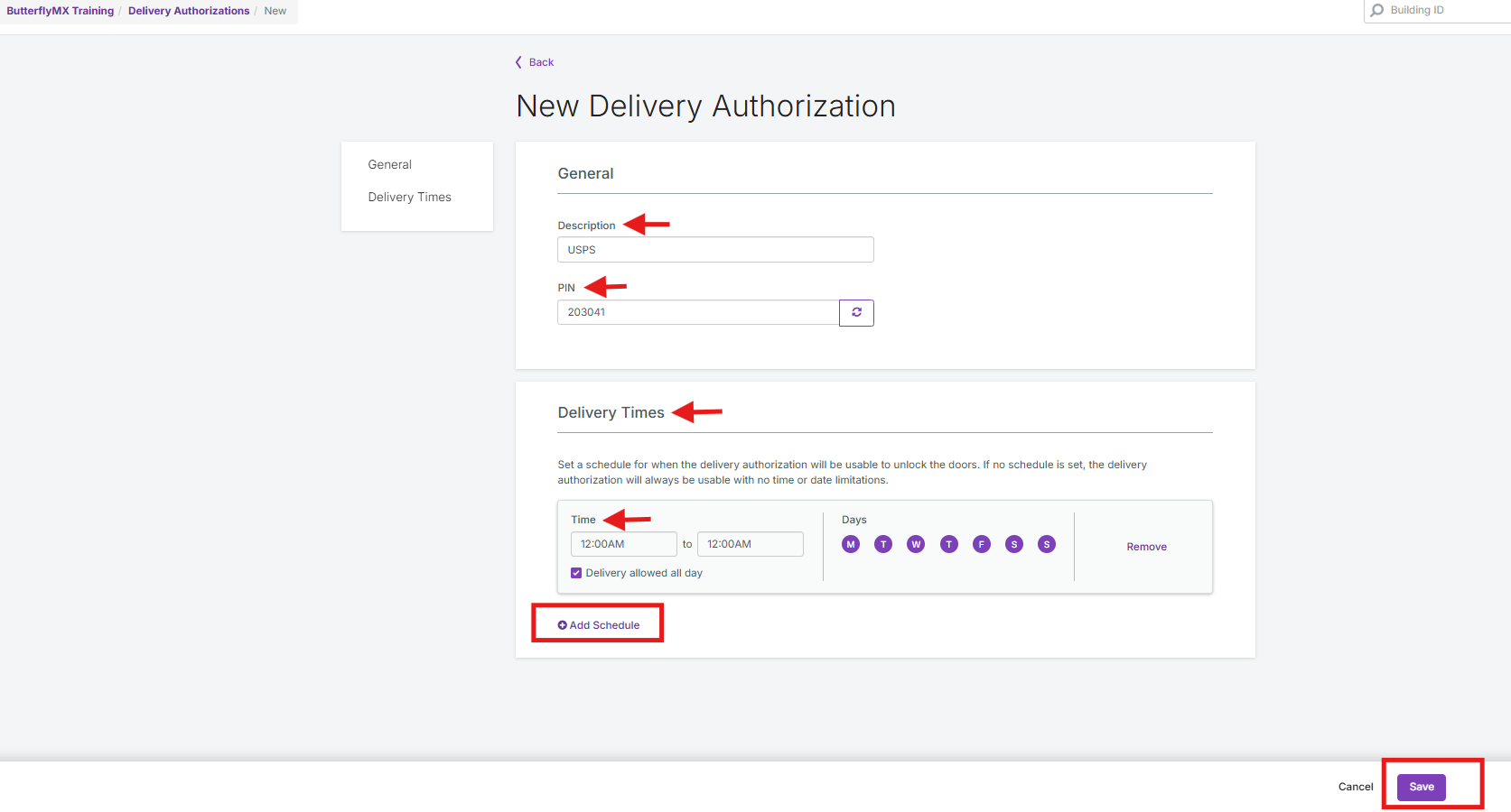 - If no schedule is set, the delivery authorization will always be usable with no time or date limitations.
