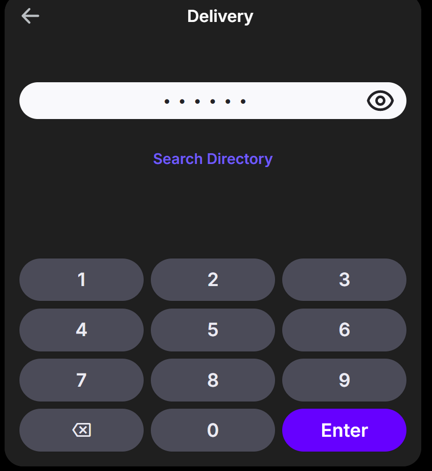 - When a package carrier or vendor clicks on the Delivery button, they will have the option to 'Enter Delivery PIN' or 'Search Directory.