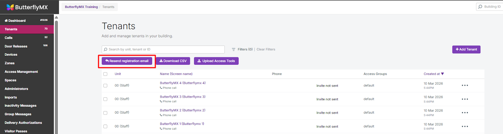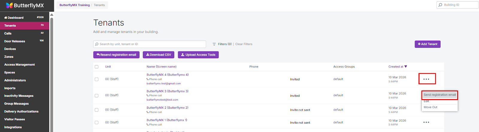 Next to their name, you will see whether they are registered. Click the three dots on the right side, then select “Send registration email.” This will resend the registration email to that specific tenant.