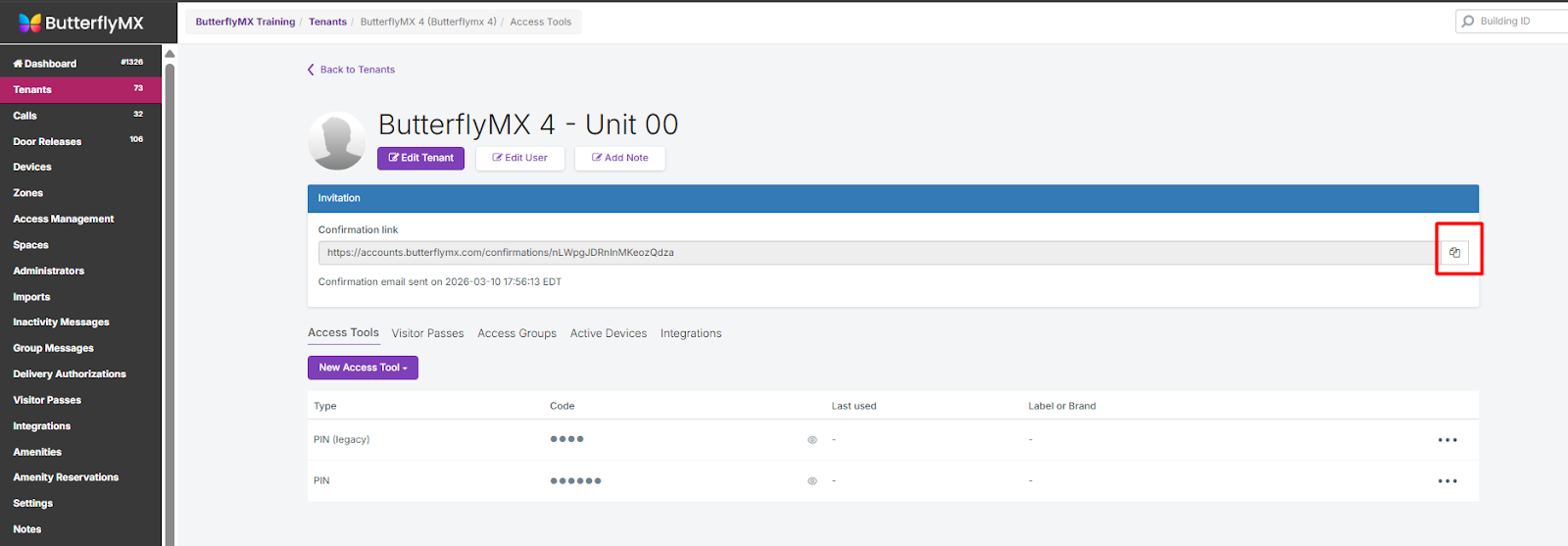 - If the registration email has been resent and the tenant still has not registered, we recommend searching for the individual tenant and clicking the“Copy to clipboard” icon, which will display a confirmation link. You can copy this link, paste it into an email, and send it directly to the tenant, asking them to complete the registration process.