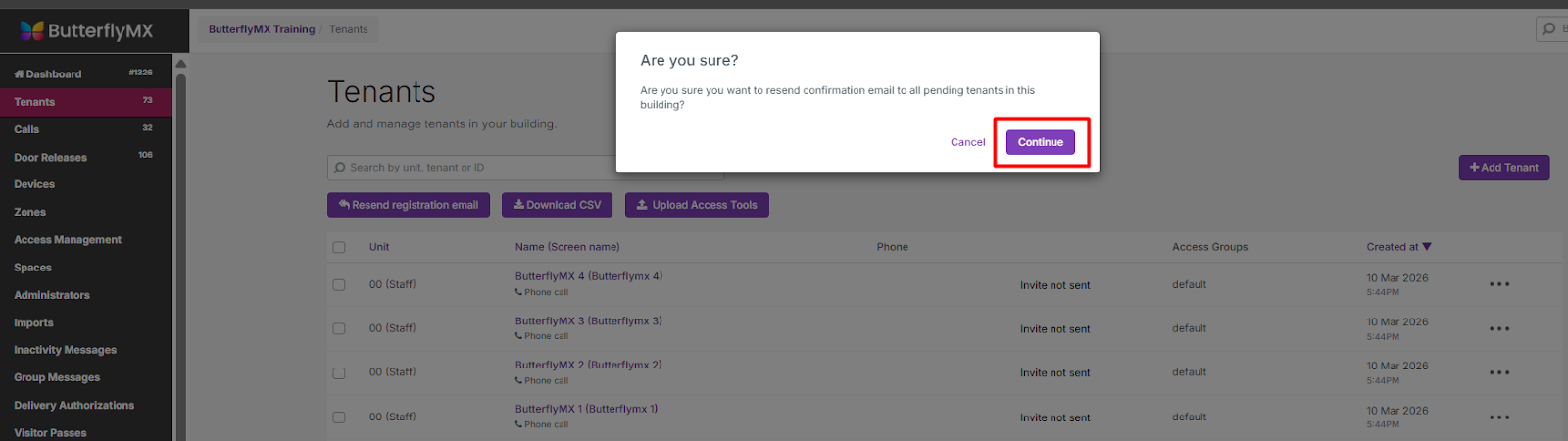 - After clicking “Resend registration email,” a confirmation message will appear asking if you are sure you want to resend the registration email. Clicking “Continue” will resend the email to all tenants whose registrations are still pending.