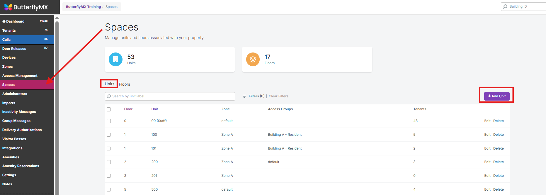 Navigate to the menu on the left-hand side of the page and click 'Spaces’. This section is a layout of your building, so you will see how many floors your building has, and which unit numbers are associated with those floors.