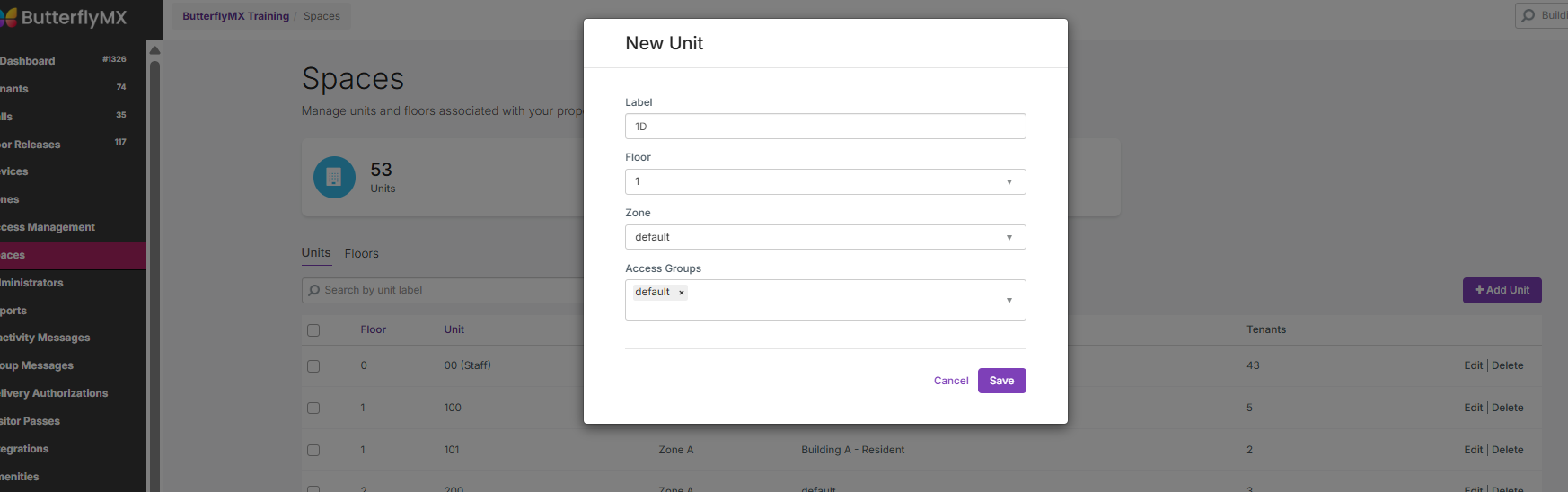 - Label — Enter the unit number or name (e.g., 101, 2A, PH). This is how the unit will appear in the ButterflyMX OS and on the intercom directory.
