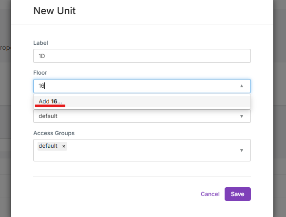 Floor — Select the appropriate floor from the dropdown list of floors you have already created. If the floor does not yet exist, you can create it on the spot by typing the new floor number directly into the floor field and clicking "+ Add floor [number]" — this will create the floor and automatically assign it to the unit without needing to navigate away to the Floors tab first.