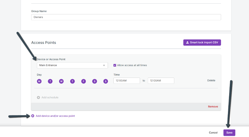If there are no devices listed, you may need to add devices once they are installed. Users in the “Owners” group will have access to the selected devices and all ButterflyMX features, but will not appear in the intercom directory.