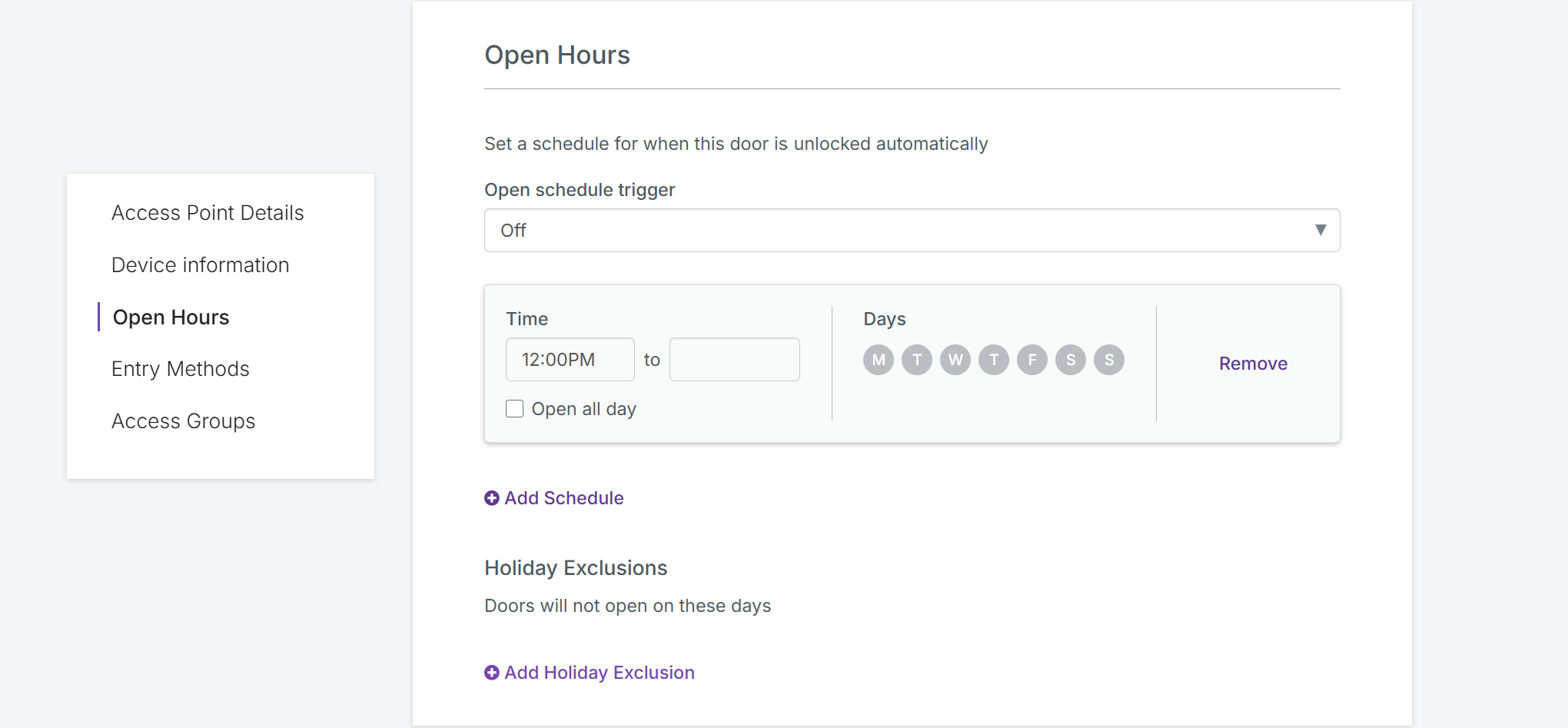 Note: Holiday Exclusions override any active Open Hours schedule — doors will remain locked on excluded dates regardless of the configured schedule.