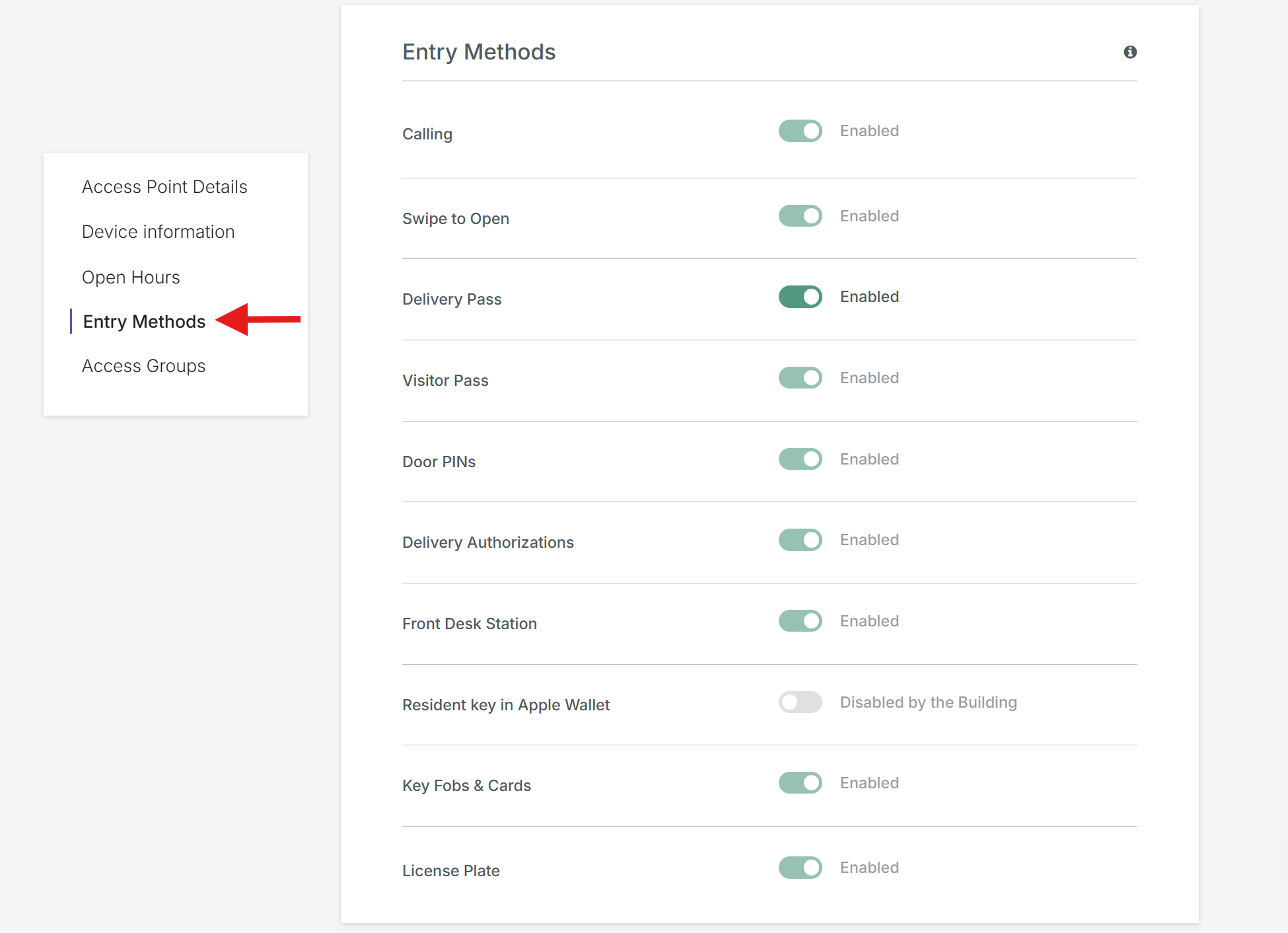 For each access point, you can decide which entry methods are available. You can enable or disable this method based on your security preferences and the specific access point's requirements: