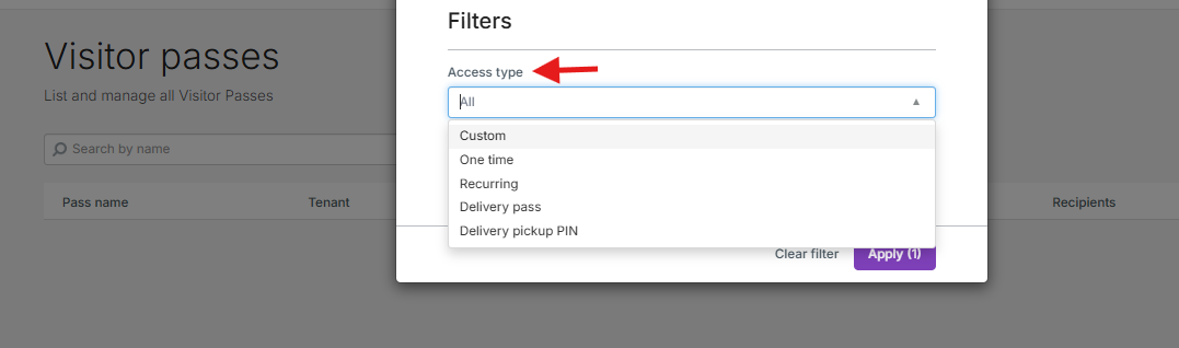 - Bajo 'Tipo de Acceso', elija entre las siguientes opciones para filtrar los pases por tipo: