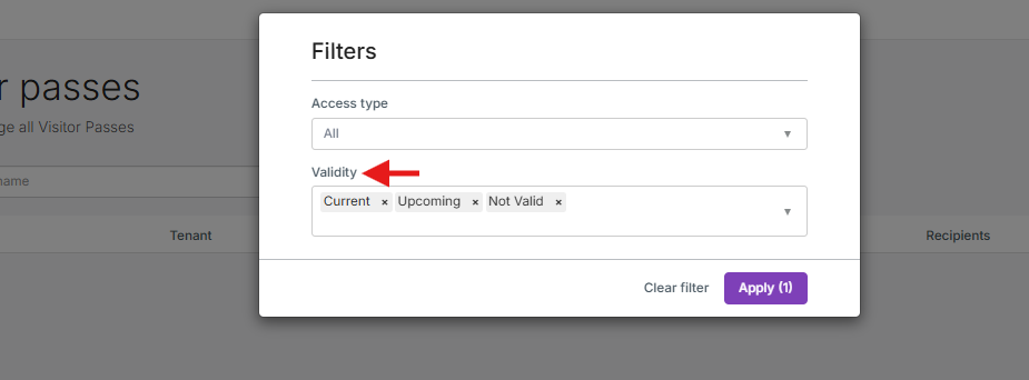 Seleccione un estado de Validez - Bajo 'Validez', elija una o más de las siguientes opciones para filtrar los pases según su estado actual:
