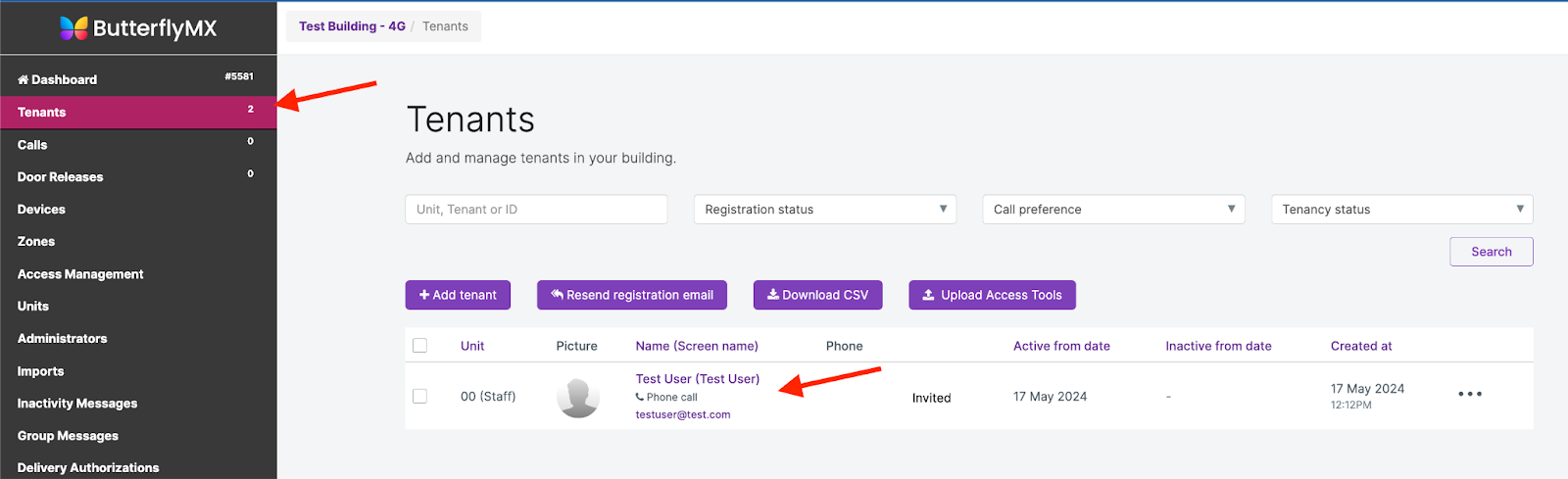 Vaya a la página de Inquilinos en su panel de control de ButterflyMX. Seleccione el inquilino para el cual desea programar el llavero o tarjeta: