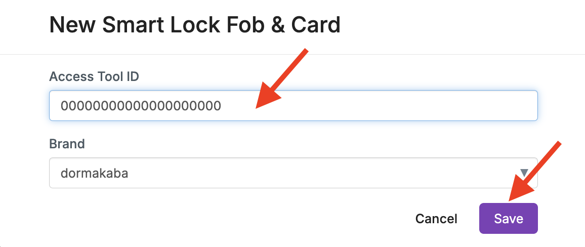 - En el campo ID de Herramienta de Acceso, ingrese el ID de 8 dígitos que está impreso en el llavero o tarjeta dormakaba y luego haga clic en Guardar. Este campo completa automáticamente los ceros necesarios cuando comienza a escribir; usted solo necesita ingresar los dígitos después de los ceros. Este llavero o tarjeta ahora está programado para las cerraduras inteligentes y los dispositivos ButterflyMX.