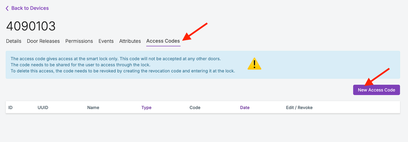 La página de Dispositivos se actualizará y ahora verá el código de acceso recién creado en la columna Código. Este código ahora puede compartirse con el inquilino y estará disponible para la vista del administrador en esta página de ahora en adelante.