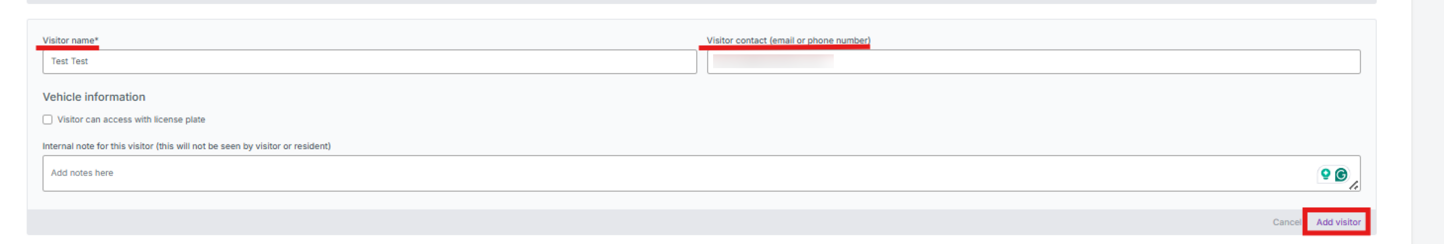 Informations sur le véhicule — Si le visiteur peut accéder avec une plaque d’immatriculation. - Note interne pour ce visiteur (cela ne sera pas vu par le visiteur ou le résident).