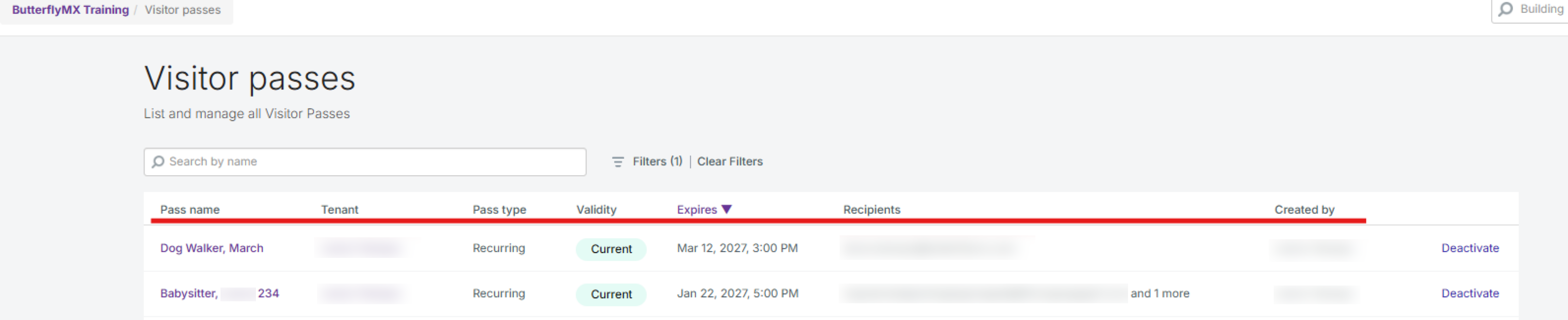 Créé par — Qui a créé le passe ?Vous pouvez supprimer un passe visiteur actif directement depuis cette liste en sélectionnant l’option « Désactiver » à côté du passe.