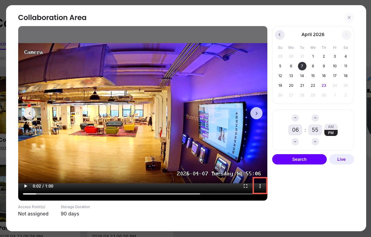 - En cliquant sur une carte de caméra, une fenêtre contextuelle s'ouvrira avec un visualiseur complet de la caméra, vous permettant de voir les images passées ainsi que le flux en direct actuel.