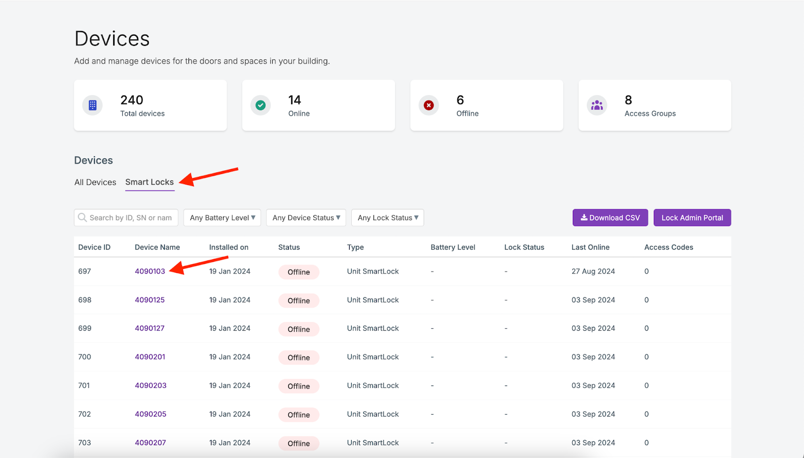 - Sous la colonne Nom de l'appareil, sélectionnez le numéro de serrure pour lequel vous souhaitez créer le code d'accès.
