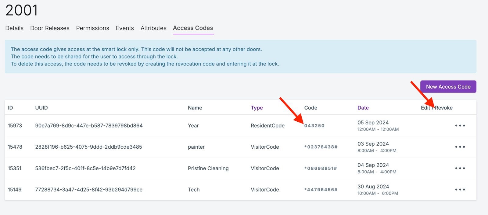 - Si vous devez révoquer l'accès à ce code à l'avenir, vous devrez naviguer vers le bouton … à droite et sélectionner Révoquer. Suivez les instructions et saisissez le code fourni sur la serrure pour révoquer l'accès.