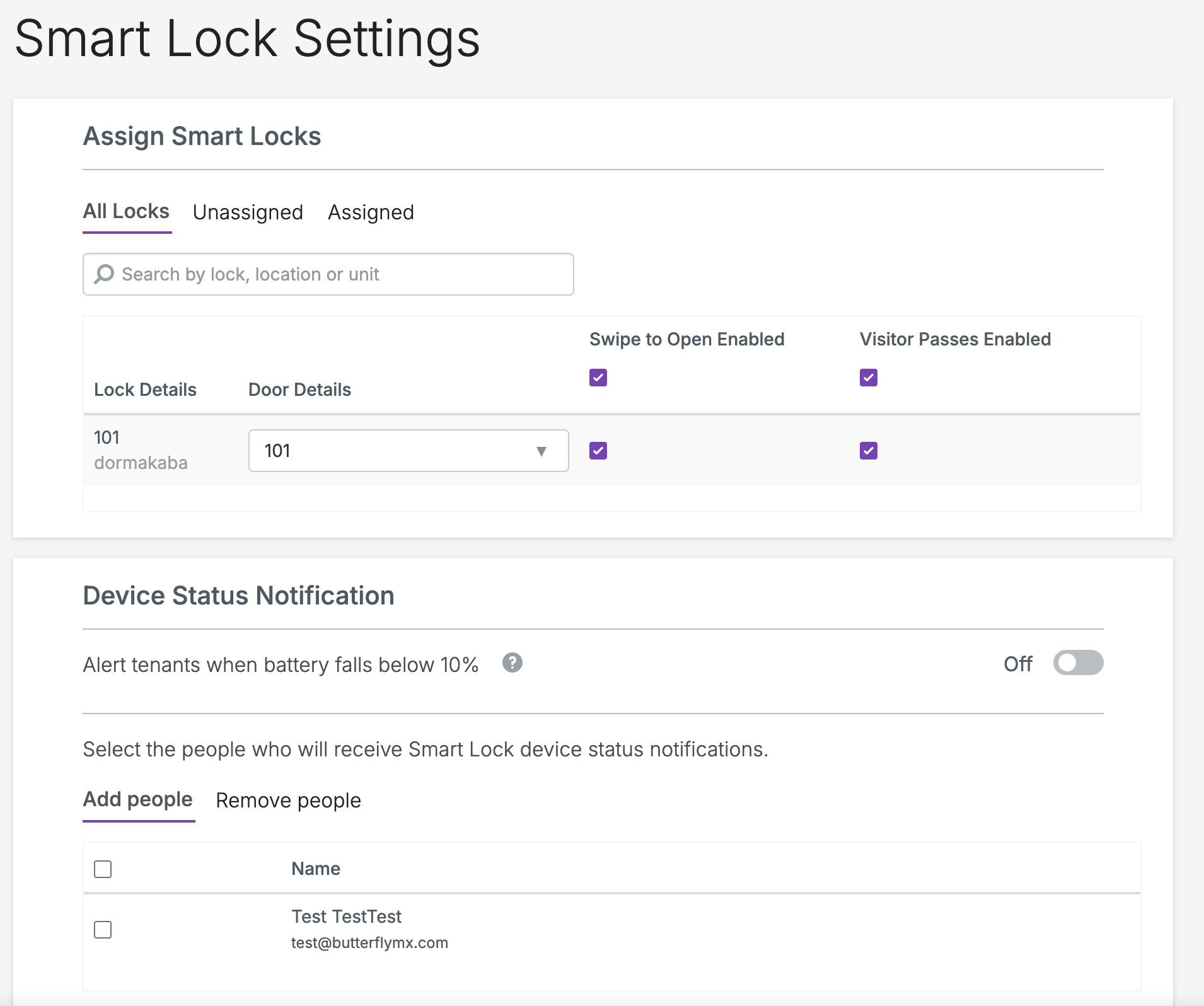 Notifications d’état de serrure intelligente pour les administrateurs : Ajoutez ou supprimez des administrateurs pour recevoir des notifications lorsqu’une serrure intelligente de la propriété signale un niveau de batterie faible ou critique. N’oubliez pas de cliquer sur enregistrer !