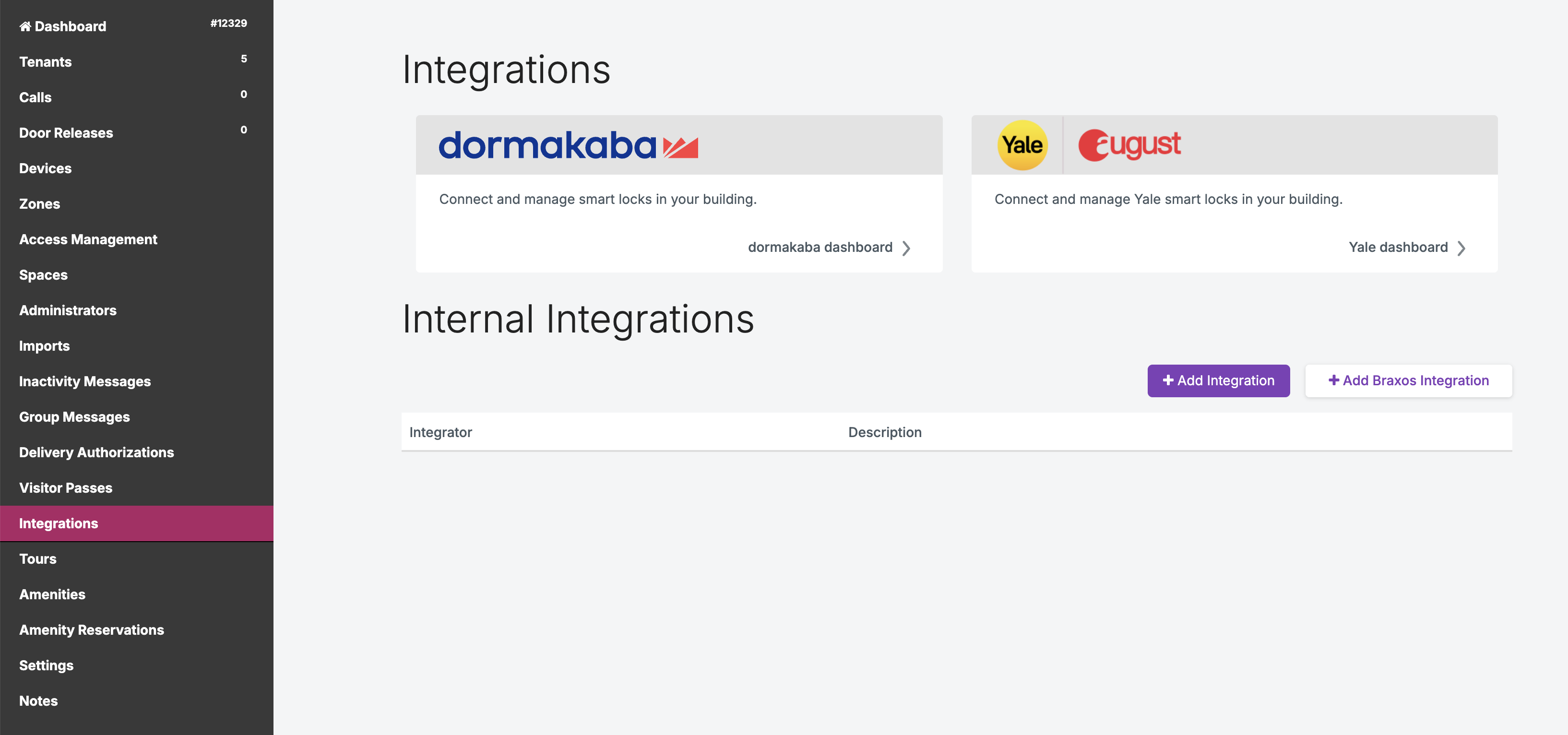 Depuis le ButterflyMX OS, accédez à la page Intégrations. Ensuite, choisissez votre tableau de bord de serrure intelligente :