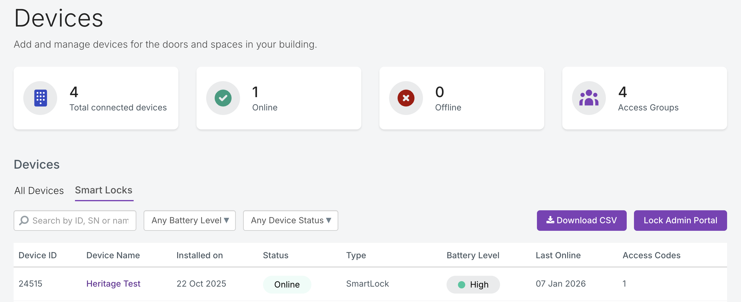- Page Appareils > Onglet Serrures intelligentes : Visualisez toutes les serrures intelligentes mises en service, leur dernier statut rapporté (en ligne/hors ligne), le niveau de batterie et le nombre de codes d'accès. Cette vue du tableau de bord est mise à jour toutes les heures.