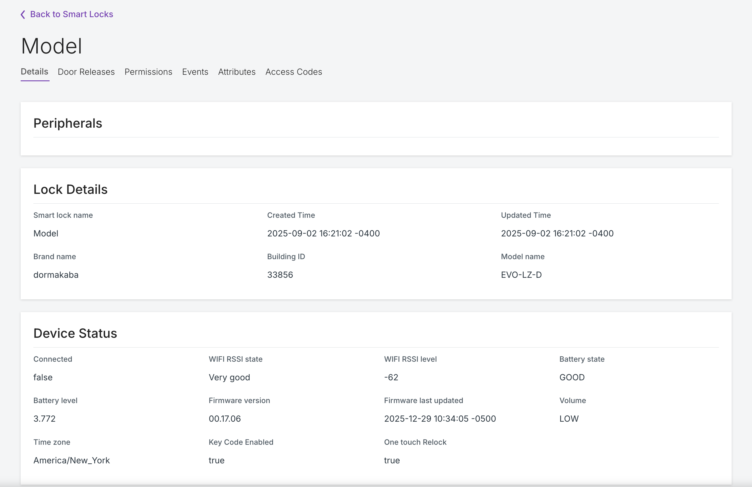 - Détail de l'appareil serrure intelligente : Pour les serrures en ligne, voyez le statut de connexion le plus à jour, l'historique des ouvertures de porte, les permissions (qui a accès) et les événements de la serrure. Les serrures non connectées au Wi-Fi nécessitent une synchronisation à la porte pour afficher les informations mises à jour.