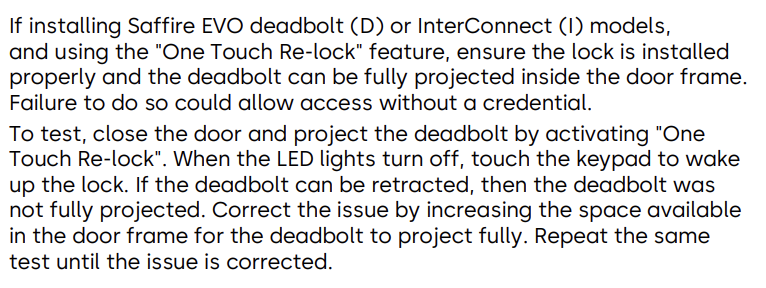 - Veuillez noter que le non-respect de l'installation correcte de la serrure et que le pêne dormant puisse être complètement projeté dans le cadre de la porte peut entraîner un accès sans identifiant. Voir la note à la page 2 du guide de mise en service ci-dessous :