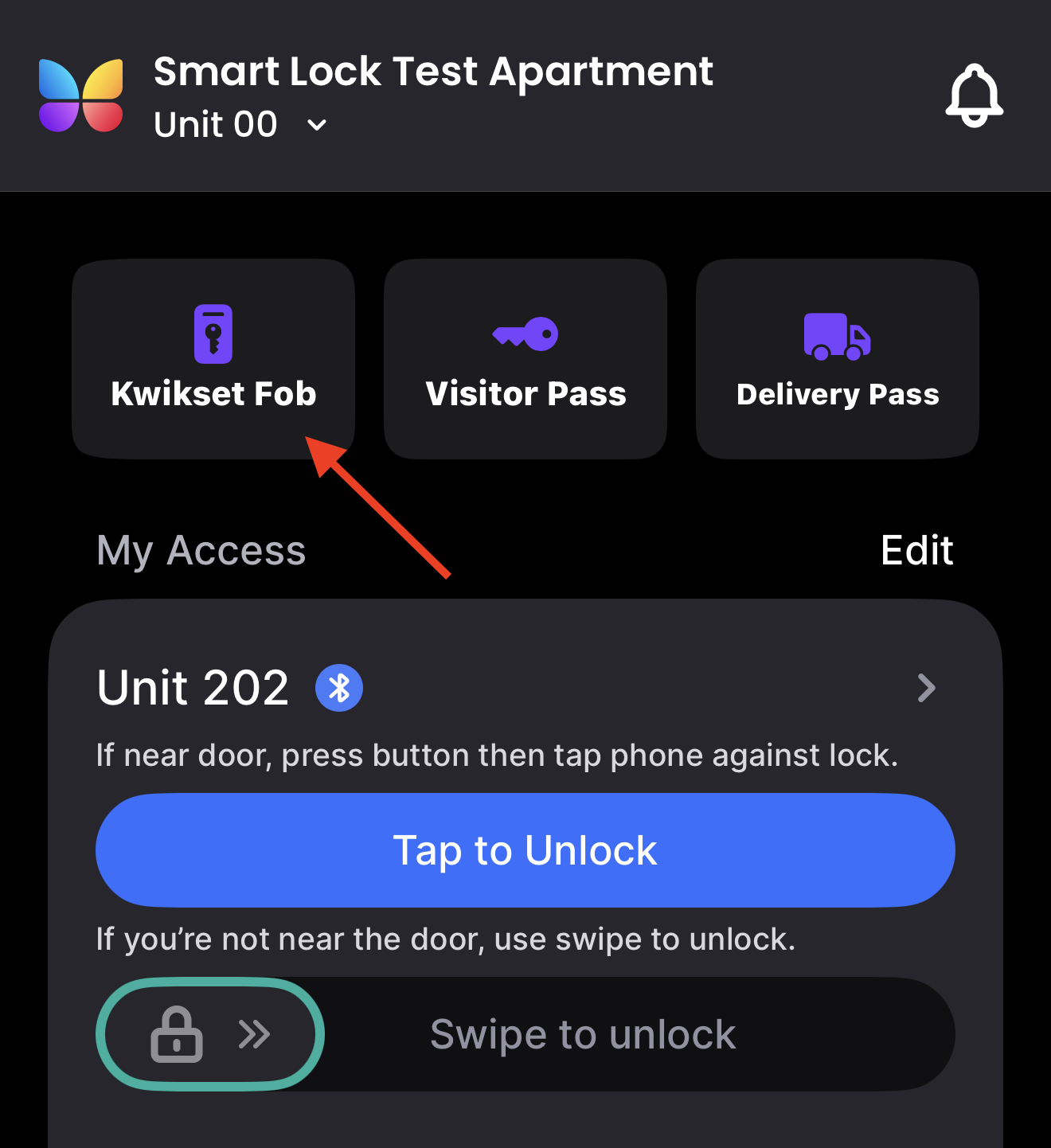 Si votre propriété utilise des serrures intelligentes Kwikset UNITE intégrées à ButterflyMX, les résidents ont deux façons d'accéder à leur unité et aux portes des espaces communs :